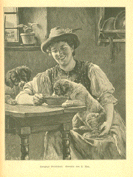 Die drei Puedelchen Wood engraving after a photograph of the painting by J.W. Martens in Rome, ca 1890. 24.5 x 18.3 cm ( 9.6 x 7.2 ") $40.00 Order Nr. DOG9742 |