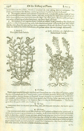 "1. Ocymum sylvestre. Wilde Basill. 2.Acynos. Stone Basill." Reverse side: " 3. Corchoros. Fish Basill.