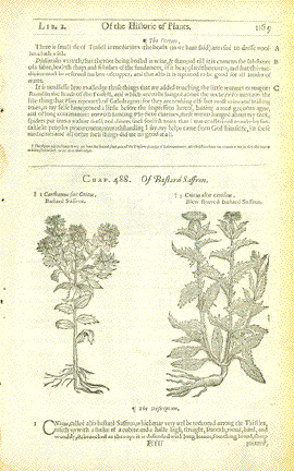 "Of Bastard Saffron" 1. Carthamus sive Cnicus" 2. Cnicus Alter ceruleus Bastard Saffron Blew floured Bastard Saffron On the reverse side is text about these plants. Binding holes near left margin edge. Light browning in right margins. Page size: 34 x 21.5 cm ( 13.3 x 8.4") $ 80.00 minus 40% = $ 48.00 Order Nr. GERARD257457 |