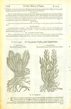 "Of the gummie Thistle, called Euphorbium" 1, "Euphorbium" 2. "Amtruphorbium" "The poysonous gum thistle" "The antidote against poysonus Thistle" On the reverse side is an image of the Melon or Hedge-hog Thistle (Melocardus Echinatus Penae Lob) Binding holes on right margin edge. Light browning in left margin. Page size: 34 x 21.5 cm ( 13.3 x 8.4") $ 80.00 minus 40% = $ 48.00 Order Nr. GERARD257458 |