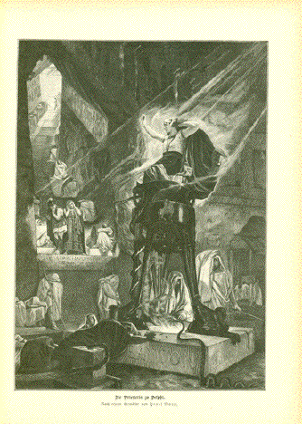 "Die Priesterin zu Delphi" (Priesters at Delph) Prophesy of Pythia in Aedyton of the Temple of Apollo Wood engraving after the painting by Henri-Paul Motte (1846-1922) Published in a German periodical. Leipzig, ca. 1890 Unrelated text print on reverse side. Image: 24,5 x 17,5 cm (ca. 9.6 x 6.9") $ 90.00 (minus 40% clearing discount = $ 54.00) Order Nr. OCCULT 257480 |