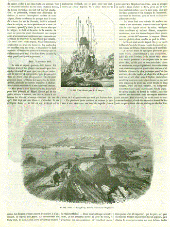 Upper image: "Pont chinois" Lower image: "Chine. - Hong-Kong. Colonie nouvelle de L'Angleterre." Image; 15 x 20 cm (ca. 6 x 7.9") ***** Reverse side: "Inde. - Extremite septentrionale du fort d'Attokk dans l'Afghanistan" (This is Fort Attokk in Pakistan) Image: 15 x 23,5 cm (ca. 6 x 9.3" Wood engravings on both sides of a page of text published ca 1850 in Paris. $ 80.00 minus 40% Discount = $ 48.00 Order Nr. CHINA257327 |