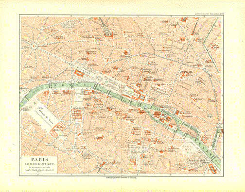 "Paris Innere Stadt" Interesting map of the center of Paris. Included is an extra page with the numbered names of important places in Paris that correspond to the locations on the map. Published 1892. Light natural age toning. Vertical centerfold. Image: 20.5 x 26 cm ( 8 x 10.2") $ 25.00 minus 40% Discount = $ 15.00 Order Nr. PARIS257220 |