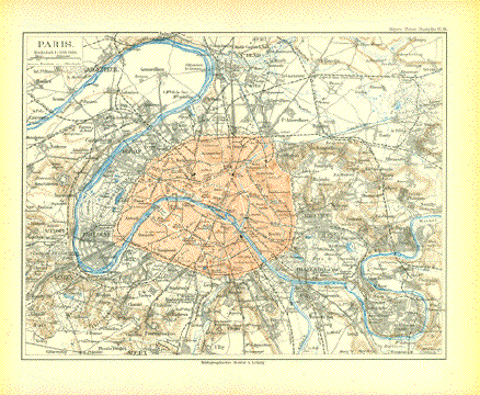 "Paris und Umgebung" Plan of Paris and the surrounding area published 1895. Light age toning. Vertical centerfold. 22 x 28 cm ( 8.6 x 11 ") $ 25.00 minus 40% Discount = $ 15.00 Order Nr. PARIS248179 |
