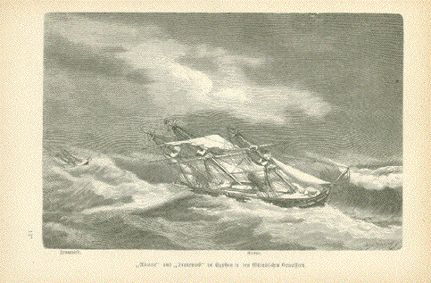"Arcona" und "Frauenlob" im Typhon in den Ostindischen Gewaessern" Wood engraving published 1874. Light natural age toning. Image: 11.5 x 17.5 cm ( 4.5 x 6.8") $25.00 minus 40% Discount = $ 15.00 Order Nr. ship257318 |