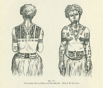 "Tattowirtes Motumaedchen aus Neu-Guinea" Wood engraving on a page of text about tatoos and jewelry of various peoples. The text continues on the reverse side. Published 1901. Image: 9 x 10 cm ( 3.5 x 3.9") $ 40.00 minus 40% Discount = $ 24.00 Order Nr. TATOO257577 |