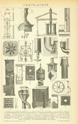 "Ventillation" Wood engraving published ca 1890. Shows many kinds of ventilation, each with a numbered description in German at the bottom of the page. Overall light natural age toning. Page size: 24.5 x 15 cm ( 9.6 x 5.9") $ 25.00 minus 40% Discount = $ 15.00 Order Nr. TECHNOLOGY257489 |