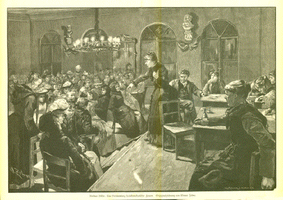 "Berliner Bilder: Eine Versammlung sozialdemokratischer Frauen" Holzstich nach der Zeichnung von Werner Zehme (1859-1924) Rückseite mit Textdruck. Altersbräunung. Vertikaler Mittelpfalz. Image: 34,5 x 49 cm (13,5 x 19,3") $ 75.00 minus 40% Discount = $ 45.00 Order Nr. WOMEN257600 |