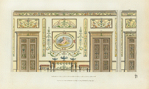 Fol. 42: Doors, some furniture, wall decoration (frescos) Hand-colored copper etching by Michel Angelo Pergolesi. Personal biographical details are missing. But Pergolesi moved from Italy to England, where he published his classicistic architectural designs in his book "Designs for various ornaments" London, 1791 Pergolesi's mentor was the neoclassical architect and furniture designer Robert Adam. Only very minor traces of age and use. Measurements within plate marks: 27 x 45 cm (ca. 10.6 x 17.7") $ 240.00 minus 40% Discount = $ 144.00 Order Nr. FURNITURE 245670 _________________