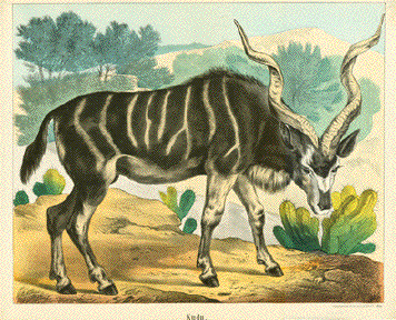 "Kudu" Fine lithograph by the Verlag Jos. Scholz in Mainz, ca 1880. Original hand coloring. Lower and upper margins are
