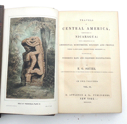 "Travels in Central America, Particularly in Nicaragua: With a Description of Its Aboriginal Monuments, Scenery and People, Their Languages, Institutions, Religion, & c., illustrated by numerous maps and coloured illustrations, by E. G. Squier, Late Charge-D'Affaires of the United States to the Republics of Central America" Volumes I and II. Published by