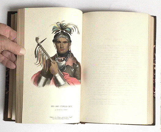MCKENNEY, THOMAS and JAMES HALL; CHARLES BIRD KING (ILLUSTRATOR). "History of the Indian Tribes of North America with Biographical Sketches and Anecdotes of the Principal ChiefsÉ" Published in Philadelphia by Rice, Rutter & Co. 1870 Vol. I only with 40 superbly hand-colored lithographic plates hightened with gum arabic. Of Native American chiefs in their dress. - Plates are in superb condition. - Plates all with original tissue guards - 333 Pages - Clean copy of this marvelous volume I. of this famous work. - Hardly ever touched or opened or read by former owner(s) - Binding: Bound in original dark brown morocco leather over marmored cardboard (please see photographs). - Former owner's name handwritten in ink on a preface page with the date July 13, 1876. - Binding with very few and only very minor traces of handling. - Spines with five raised bands - Spine in 5 compartments. Second and forth compartments with title and Vol. I. Lettered in gilt. The other compartments impressed with botanical symbol - The three edges gilded Please see content of plates in added list. This work was originally published in 3 volumes with a total of 100 plates We have only Vol. I for sale with 40 plates. Plate nr. 1 in this volume:"Hunting the Buffalo" plus 39 lithographs of American Native Chiefs. $ 3500.00 net liquidation sale. Order Nr. EXCLUSIVE257519 |