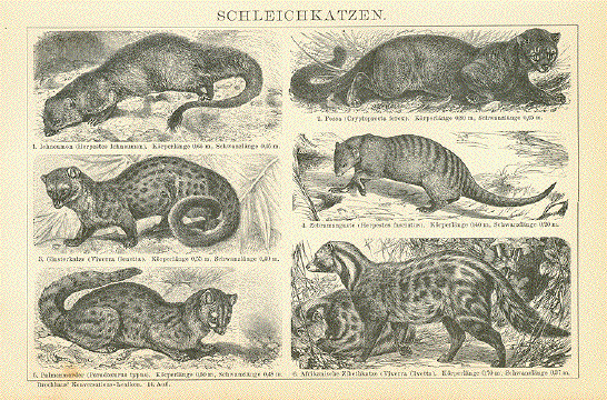 ( Viverridae ) Wood engraving 1895. Small sport in lower left image. 13.5 x 21 cm ( 5.3 x 8.2 ") $ 20.00 Order Nr. CAT244486 |