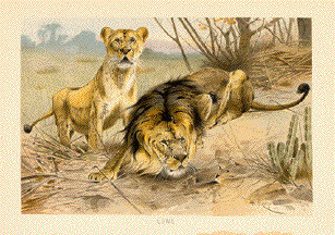 "Kaploewe ( Felis leo capensis)" ( South African Lion) Wood engraving by Specht, Ca 1895. Reverse side is printed. 19.7 x 13.7 cm ( 3.8 x 5.3 ") $ 25.00 Order Nr. CAT237981 |
