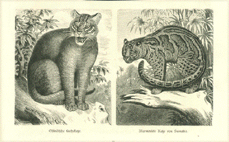 "Ostindisches Luchskatze Marmorite Katze von Sumatra" Wood engravings published 1880. Reverse side is printed. Images together: 14 x 23.5 cm ( 5.5 x 9.2") $ 35.00 Order Nr. CAT253408 |