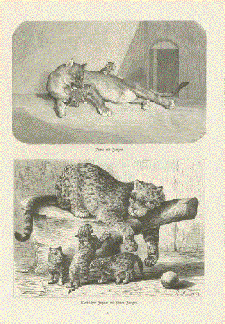"Puma mit Jungen" Wood engravings on the front and reverse side of a page published ca 1880. $ 80.00 Order Nr. CATLION253555 |