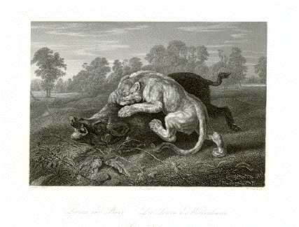 "Lioness and Boar. Die Loewin u. d. Wildschwein" Steel engraving by W. French after Snyders ca 1860. 11.5 x 16.5 cm ( 4.5 x 6.4 ") $ 25.00 Order Nr. CAT248101 |