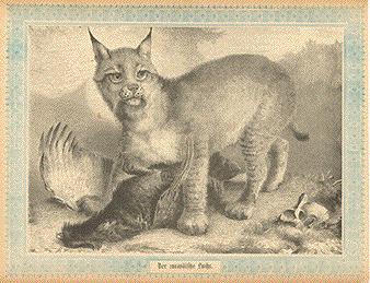 European Lynx. Lynx virgatus. Wood engraving ca 1895. On backside is image of a Caracal. 10.5 x 15.7 cm ( 4.1 x 6.2 ") $ 20.00 Order Nr. CAT9141 |