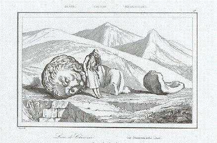 "Lion de Cheronee. Der Cheronesische Loewe" Steel engraving after Dupre, 1869. 8.7 x 12.2 cm ( 3.4 x 4.8 ") $ 40.00 Order Nr. GREECE243775 |