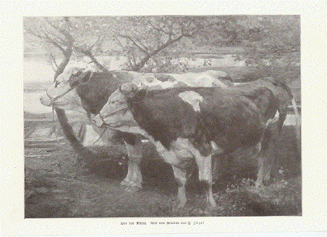 Freiburger Rind (Bos taurus friburgensis) Wood engraving after G. Muetzel