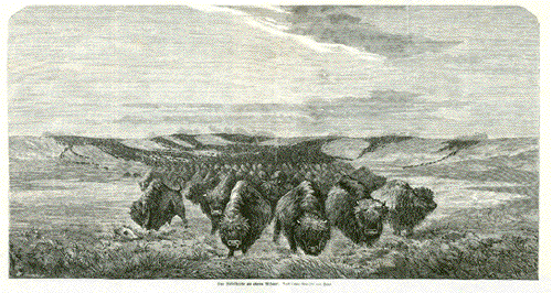 "Eine Buffalheerde am Oberen Missouri" Wood engraving ca 1870. To the