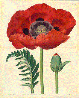 No title. Red poppy Originally hand-colred copper etching by j. Watts After the drawing by M. Hart Published in "Botanical Magazine" founded 1787 by William Curtis (1746-1799) Dated London, 1822 Botanical Magazine was printed in V8 format. The double pages, like this of the poppy, therefore have a horizontal