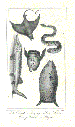 Clupea The Common Herring. The Silver-Stripd Herring. The African Herring. Copper engraving by J. Pass after H. Bloch. Published in London1801. 19.8 x 18.2 cm ( 7.8 x 7.2 ") $ 45.00 Order Nr. FISH9068 |