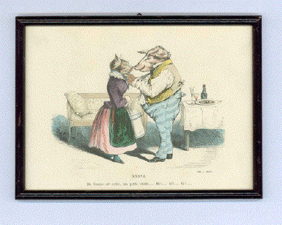 Here is a collection of lithographs in superb original hand coloring and condition from his "Les Métamorphoses du Jour" edition of 1853 in which he so exquisitly uses the people-animal-metamorphosis to characterize lovable and less lovable characteristics of all of us people. Prints have normal age toning, and light browning along margin edges. Minimal light spotting on a few prints. Margins are larger than shown on theses scans.