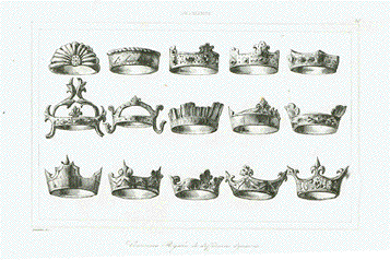 "Couronnes royales de differentes dynasties" Steel engraving by Lemaitre ca 1845. 9 x 14.5 cm ( 3.5 x 5.7 ") $ 30.00 minus 40% Discount = $ 18.00 Order Nr. HERALDRY246549 |