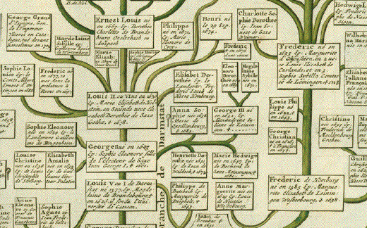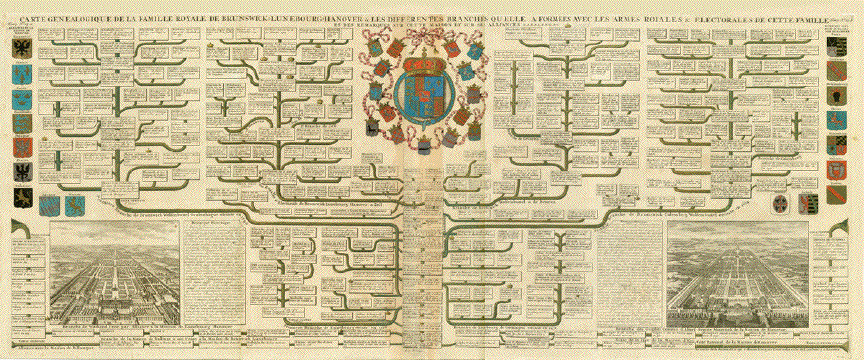 "Carte Genealogique de la Famille Royale de Brunswick-Lunebourg-Hanover & les différentes Branches qu'elle a formées avec les Armes Roiales & Electorales de cette Famille" Chart (family tree) of the Royal families of Braunschweig-Lüneburg-Hannover Chart has a most decorative arrangement of the main Coat of arms surrounded by the various related families' coats of arms. On the left coats of arms in original hand coloring: Emperor, France, Sweden, Denmark, Poland, Prussia, Palatinat, Bavaria and Nassau On the right coats of arms in original hand coloring: Saxonia, Lorraine, Mecklenburg, Hesse, Württemberg, Holstein, Baden, Anhalt, Modena There are two integrated copper etchings in the chart. On the left: Chateau of Salzdahlum in Wolfenbüttel (not existing any more) On the right: Chateau de Herrenhausen in Hannover The family tree begins on the left side with Wittekind and on the right with the origin of the Guelphs. It ends shortly before Chatelin published his work in 1720 Copper etching with splendid original hand coloring in gouache style Published in: "Atlas Historique, Ou Nouvelle Introduction A l'Histoire, à la Chronologie & à la Géographie Ancienne & Moderne: Représentée dans de Nouvelles Cartes, Où l'on remarque l'établissement des Etats & empires du Monde, leur durée, leur chûte, & leurs differens Gouvernemens" Amsterdam, 1720 Author: Henri Abraham Chatelain (1684-1743) This impressive print, rarely with its original hand-color, would be anyone whose ancestors are here shown. Condition: Print has light general age toning, a very pleasant patina. The original coloring of the coats of arms is simply superb. On order to fit into Chatelain's atlas this very large print had to be folded vertically several times. In order to prevent the oxidation of the original colors, the reverse side of the print has been duplicated with very thin china paper in back of the coats of arms and some of the green lines which lead from one family member to the next. 42 x 103 cm (ca. 9.5 x 40") $ 800.00 minus 40% Discount = $ 480.OO Order Nr. HERALDRY253340 |