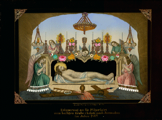 "Erinnerung an die Pilgerfahrt zum heiligen Grabe Christi nach Jerusalem im Jahre 1867" (Reminiscense of the pilgrimage to the Holy Sepulcher of Christ to Jerusalem, 1867) Chromolithograph printed in color and adorned with lacquer flowers, raised silver lace and raised silver and gold decor on challise, candle sticks, lamps and dress bordures. The four corners of lithograph raised with decorative silver triangles.An elaborate extremely well preserved religious piece of art. Published by Felgner. Berlin, 1867 Some minor traces of age and handling. In general: Very good condition 35 x 48 cm (ca. 13.8 x 18.9") $ 450.00 Order Nr. JESUSCHRISTUS251892 |