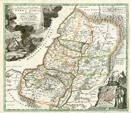 "Iudaea seu Palestina ob sacratissima Redemtoris vestigia hodie dicta Terra Sancta prout olim in duodecim Tribus divisa separatis ab invicem Regnis Iuda et Israel expressi insuper VI ultimi temporis ejusdem Terrae Provinciis..." Palestine or Israel , divided in the 12 territories of tribes of Israel. The baroque cartouche shows Mose receiving the Ten Commandments. Lower right inset: Mose and the High Priest pointing at map showing the paths the Children of Israel took after leavin Egypt. Above the little inset the two slaves carrying the heavy weight of the cluser of grapes. Copper etching. Published by Johann Baptist Homann. Nuremberg, 1723. One repaired tear. Otherwise map is in very good condition. Vertical centerfold. Order Nr. HOLYLAND236006SOLD |