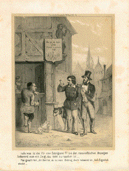 Text: "Jude, was ist das für eine Betruegerei? bei den reformistischen Anzeigen bekommt man ein Zeug, das nicht zu rauchen ist." "Wau geschrien, Ihr Herren, es ist kein Betrug, doch bekannt ist, dass Eigenlob stinkt" Clearly antisemitic lithograph in word and picture. The two men complain about the quality of the tobacco they had bought from the Jewish dealer on account of his fraudulent advertising. And he answers smartly: "It's no fraud. It is known that self praise stinks (He that praises himself, spatters himself). Anonymous toned lithograph. Published Duesseldorfer Monatshefte, a periodical, published in Duesseldorf. 1853 21,7 x 16,5 cm (ca. 8.5 x 6.5") $ 60.00 minus 40% Discount = $ 36.00 Order Nr. JUDAICAANTISEMITISM247347 |