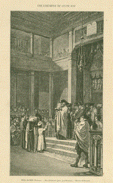 Sanhedrin" The council was made up of the Nasi (President), an Av Beit Din (Chief of the Court) and 69 council members. The meeting took place in the Temple in Jerusalem and took place every day except on days of festivals and Shabbat. Copper engraving after Sebastian Leroy published 1827. Published in Sainte Bible de Vence by Henri-Francois de Vence. Print has vertical centerfold to fit original book size. A few scattered spots in margins far away from image. Image size: 16.5 x 21cm ( 6.4 x