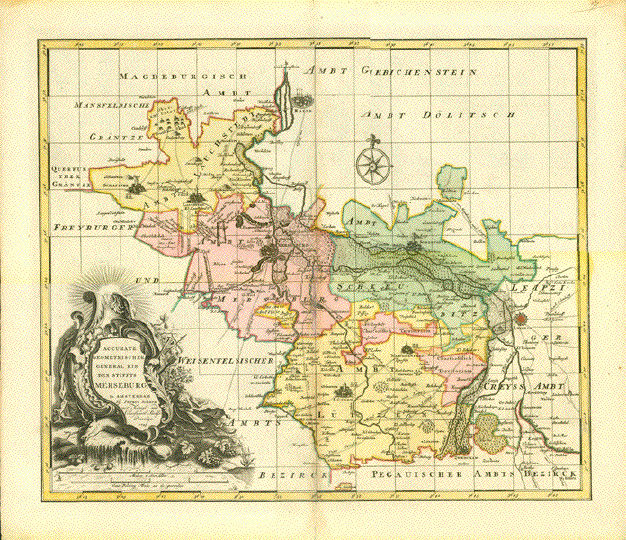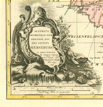 ãAccurate Geometrischer General Ris des Stiffts Merseburg" Wunderschön altkolorierte Kupferstichkarte von Petrus Schenk jr. (1693-1775) Amsterdam, datiert 1745 Sehr detaillierte und dekorative Karte des südlichen Teils von Sachsen-Anhalt mit dem Verlauf der Saale von Dalitz bis Halle und der Gegend um Leipzig. Links unten barocke Titelkartusche. Der vertikale Mittelfalz wurde von alter Hand teilweise hinterlegt 46 x 55,5 cm $ 450,00 (Net Liquidation Price / Netto Ausverkauf-Preis) Order Nr. DEUTSCHLAND257556 |