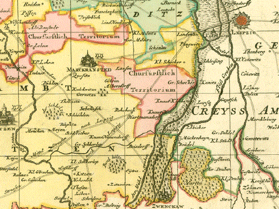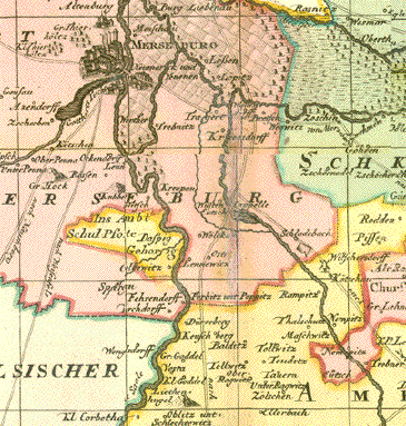 Wurzen, Eilenburg, Bad Düben, Sachsen "Accurate Geographische Delineation des Stiffts-Ambts Wurtzen nebst dem Aembtern Eulenburg und Düben mit denen darein gehörigen Städten, Flecken und Dorffschafften auch angraentzenden Orthen" Altkolorierte Kupferstichkarte von Peter Schenk d.J. (1693-1775) Amsterdam, ca. 1755 Very nicely kept copper etching by Pieter Schenk junior (1693-1775) Sehr detaillierte und attraktive Kupferstichkarte von Peter Schenk Jr.mit barocker Kartuschenpracht. Oben rechts 2 Wappensiegel von Wurzen, Stadtwappen von Eulenburg und Stadtwappen von Büren. Gehalten von barocken Putti. Unten links barocke Titelkartusche mit einem Meilenanzeiger. Mit planquadratischer Bezifferung oben unten / links rechts Beispiel A / a, um Orte, Wälder, Berge, Gewässer und andere geographisch bemerkenswerte Punkte leicht zu lokalisieren. Diagonal durch die sehr attraktive und sehr detaillierte Karte der Lauf der Mulde von Trebsen bis Muldenstein in Sachsen-Anhalt. Sehr guter Erhaltungszustand. Mittelfalz restauriert. Die äusserste Margebecke links oben fehlt. 47,5 x 58 cm (ca. 18.7 x 22.8") $ 580.00 (net. Liquidation sale. Netto Ausverkaufspreis) Order Nr. DEUTSCHLAND257521 |