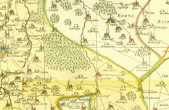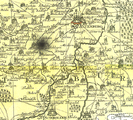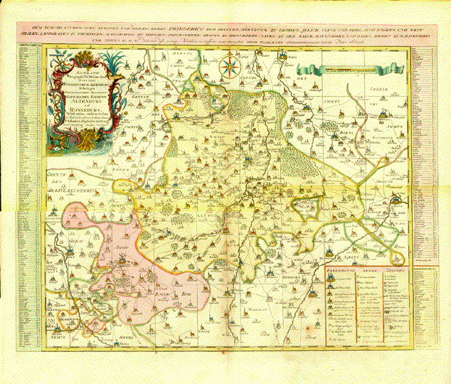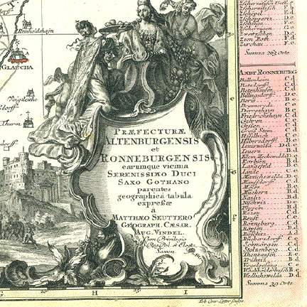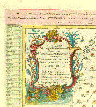 "Praefecturae Altenburgensis et Ronneburgensis earumque vicinia Serenissimo Duci Saxo Gothano parentes geographica tabula expressae a Matthaeo Seuttero Geograph. Caesar. Aug. Vindel" Altkolorierte Kupferstichkarte von Tobias Conrad Lotter (1717-1777) Erschienen bei Mattheus Seutter (1678-1757) Augsburg, ca. 1740 Sehr detaillierte Umgebungskarte der Städte Altenburg, Thüringen und Ronneburg, Thüringen. Im Norden reicht die Karte bis Lukas und Borna, im Osten bis Penig, im Süden bis südlich von Glauchau und Crimmitschau, im Westen bis Weida und Gerau. Sehr gut erhaltene Landkarte mit ausgezeichnetem Altkolorit. Im unteren Bereich Titelkartusche im barocken Stil. Links unten Meilenanzeiger. Ausserhalb der Karte links und rechts Ortsverzeichnisse mit Suchangaben zum Planquadrat. Margen oben und unten schmal. Schwarze Rand ist Scan Hintergrund. Black margins are scan background and not part of map. 49,3 x 58 cm $ 380.00 (Net liquidation price / Netto Ausverkaufpreis) Order Nr. DEUTSCHLAND257557 |