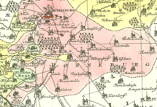 Altenburg, Ronneburg, Thüringen "Praefecturae Altenburgensis et Ronneburgensis earumque vicinia Serenissimo Duci Saxo Gothano parentes geographica tabula expressae a Matthaeo Seuttero Geograph. Caesar. Aug. Vindel" Altkolorierte Kupferstichkarte von Tobias Conrad Lotter (1717-1777) Erschienen bei Mattheus Seutter (1678-1757) Augsburg, ca. 1740 Sehr detaillierte Umgebungskarte der Städte Altenburg, Thüringen und Ronneburg, Thüringen. Im Norden reicht die Karte bis Lukas und Borna, im Osten bis Penig, im Süden bis südlich von Glauchau und Crimmitschau, im Westen bis Weida und Gerau. Sehr gut erhaltene Landkarte mit ausgezeichnetem Altkolorit. Im unteren Bereich Titelkartusche im barocken Stil. Links unten Meilenanzeiger. Ausserhalb der Karte links und rechts Ortsverzeichnisse mit Suchangaben zum Planquadrat. Margen oben und unten schmal. 49,3 x 58 cm $ 380.00 (Net liquidation price / Netto Ausverkaufpreis) Order Nr. DEUTSCHLAND257583 |