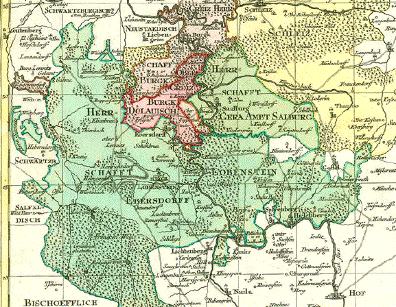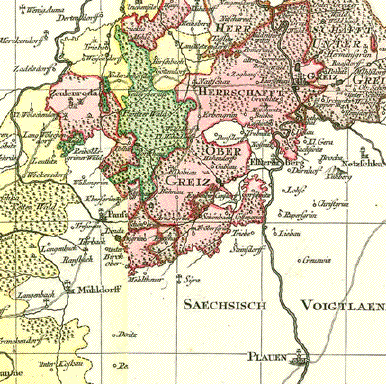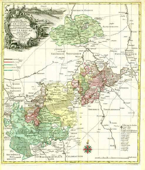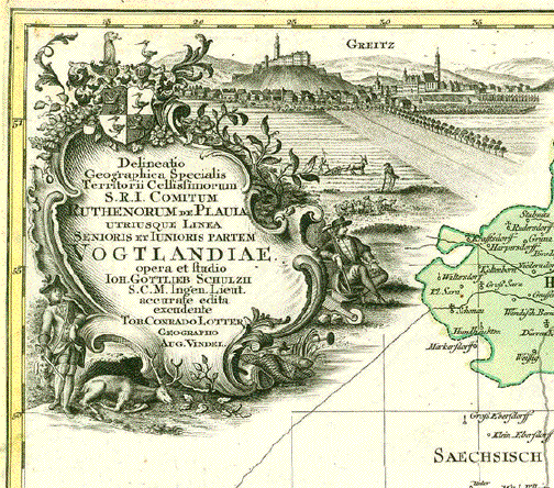 Vogtland, Thüringen, Sachsen, Franken, Böhmen (Tschechien), Gera, Greiz, Schleiz, Zwickau, Hof, Saalburg, Lobenstein, Weiße Elster, Saale, Göltzsch Vogtland. - "Delineatio Geographic Specialis Territorium Celsissimorum S.R.I Comitum Ruthenorum de Plauia untriusque Linea Senioris et Iunioris Partem Vogtlandiae opera et studio Joh. Gottlieb Schulzii S.C.M. Ing. Lieut. Accurate edita excedente Tob. Conrado Lotter Geographo Aug. Vindel." Altkolorierte Kupferstichkarte des Vogtlandes Von Georg Friedrich Lotter Erschienen bei Tobias Conrad Lotter (1717-1777) Augsburg, ca. 1750 Sehr guter Erhaltungszustand. Sehr attraktives Altkolorit. In der Titelkartusche eine Ansicht von Greiz. Der Lauf des Flusses Weiße Elster von Adorf bis Crossen. Der Lauf der Saale von Hof bis Obernitz. Die Herrschaften Gera, Greiz, Ebersdorf etc. Siehe Detail-Fotos. 57,5 x 49,5 cm $ 360.00 (Net liquidation sale / Netto Ausverkaufspreis) Order Nr. DEUTSCHLAND257565 |