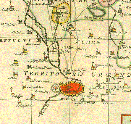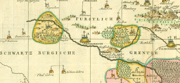 "Derer zu dem Thuringischen Creisse des Churfürstenthums Sachsen gehöhrigen Aemter Sachsenburg und Weissensee richtige Delineation nebst allen andern angrenzenden Gegenden. In Amsterdam by Petrus Schenk ÉPrivilegie 1753" Altkolorierte Kupfertstichkarte von Peter Schenk Jr. (1693-1775) Amsterdam, 1753 Bestens erhaltene, detaillierte, wunderschön altkolorierte Karte von Weissensee und Sachsenburg und ihrer Umgebung. Die Karte reicht im Norden bis zum Kyffhäuser, im Osten bis Rastenberg, im Süden bis Erfurt, im Westen bis Marolterode. Deutlich eingezeichnet ist das Geflecht von Flüssen und Bächen in einem grossen Teil des Thüringer Beckens und auch kleine Ortschaften mit ihren im 18. Jahrhundert üblichen Namen. Links und rechts von dem geographischen Teil der Karte Liste der Ortschaften, Berge, Gewässer etc. Links unten die Titelkartusche, rechts unten Meilenanzeiger und Legendenschlüssel. Sehr attraktiv! 47,5 x 57 cm $ 450.00 (Net liquidation sale / Netto Ausverkaufspreis) Order Nr.DEUTSCHLAND257594 |