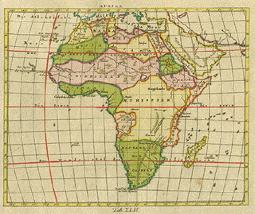 "Carta che serve di spiegazione alla Navigazione Intorno All'Africa ed alla direzione delle pricipali correnti nell'Oceano Atlantico ai venti regulare." Copper engraving ca 1780. Very interesting map of Africa showing navigation routes inland and of special interest; the currents in the Atlantic Ocean. At the top of the map is part of Spain and the Medterranean Sea. In the upper right if Arabia. A small part of Brazil with Rio and San Agostino is in the lower left corner. Map is clean. Several folds to fit book size. 23 x 29.2 cm ( 9 x 11.4 ") $ 80.00 Order Nr. AFRICAMAP1653 |