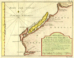 " Carta della Costa di Angola dal Fiume Bengo sino a quello di Quanza". Copper etching by Bellin ca. 1750. Modern hand coloring. A detailed map of the coastal area from the Congo-Angola border in the north as far south to Cuanza. Map has overall light toning and folds to fit atlas. Condition is Very Good. 20.1 x 26.2 cm ( 7.9 x 10.3 ") $ 130.00 Order Nr. AFRICAMAP1575 |