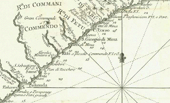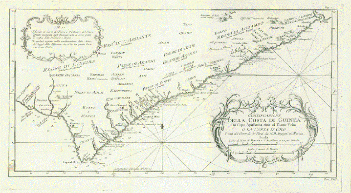 "Continuazione Della Costa di Guinea Da Capo Apollonia sino al Fiume Volta o La Costa D'Oro" Copper engraving map for the Italian atlas after Jacques-Nicolas Bellin. Printed on hand-made strong