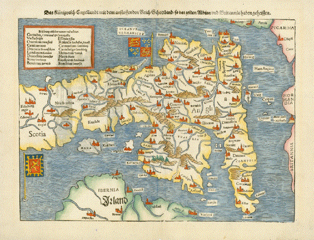 ãDie Britischen Inseln von Wilhelm dem Eroberer bis zum Regierungs-Antritt des Hauses Tudor 1166 bis 1485". (The British Isles from William the Conquerer until the House of Tudor taking power 1166 - 1485.) Steel etching by C. Poppey. 1846. Original hand outline coloring.
