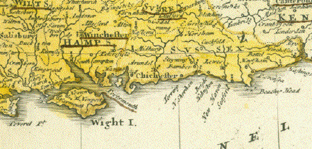 Original hand outline coloring.Very detailed map of southern England. In the lower left is a detailed inset of the Channel Islands of Jersey and Gurnsey.