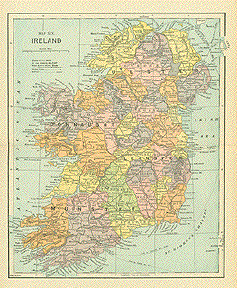 Steel engraving map with hand-drawn lines showing the regions of Ireland.