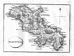"Carte de L'Isle de La Martinique, Colonie Française dan les Antilles". Copper etching by Rigobert Bonne (1729-1795) , published ca 1780. Modern hand coloring. This detailed map of Martinique shows even the sandbanks surrounding the island. Waterways and mountains add a topographical note. Map is on the typical uneven, thin (but very strong) paper of many maps of this time. In upper and left margins are thin creases not disturbing image. General condition is Almost Very Good. 31.4 x 20.2 cm ( 13.3 x 7.9 ") $ 180.00 Order Nr. CARIBBEANMAP2126 |
