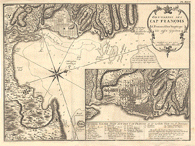 "Grundriss Des Cap François od. Franzoesischen Vorgebirges und dessen Gegenden." Copper engraving ca 1760. This very detailed map shows the area of Cap Francois on the northern coast of the Dominican Republic. The map is not "northed" so that "north" is the line going into the title cartouche. In the lower left is an inset in great detail. The numbered list corresponds to the numbers of various monuments and details on the map. Map has hardly visible vertical folds to fit book size. Narrow margins. Light water stain in lower right corner. Strong clean impression. 22.5 x 30.7 cm ( 8.8 x 12 ") $ 250.00 Order Nr. CARIBBEANMAP2160 |
