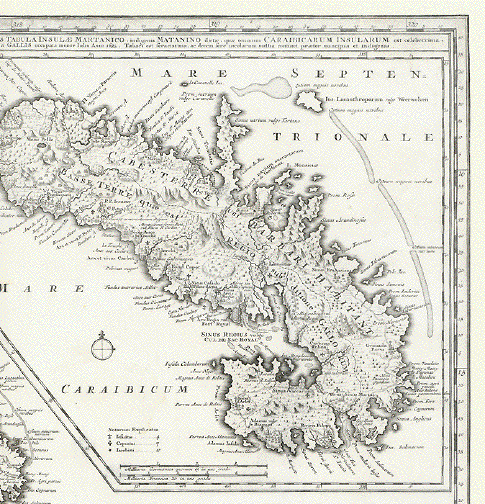 ãTabula Novissima atque accuratissima Caraibicarum insularum sive Cannibalum quae etiam Antillae Gallicae dicuntur, itedm insulae Supraventum, et in Archipelago Mexicano sditae sunt, ac detectae a Christ. Columbo Anno 1493..."Copper etching by Reinero Ottens. Published by I. Ottens. Amsterdam, ca. 1730. Showing in amazing detail among many other islands: Guadeloupe, Terra Magna, Dominica, Desiderata, Maria Galanta, Martanico (Martinique), Santa Lucia, Barbados, St. VincentBeke (Bequia), Moustiques, Cannaouan, Concordia, Cariouacou, Granata. And in a rather larghe inset a very detailed map of the island of Martanico (Martinique) Orignal hand outline coloring on several islands. Clean! Three margins have been professionally widened. Verso blank.. Horizontal centerfold. 60 x 50 cm (23.4 x 19.5"). Order Nr. CARIBBEAN MAP242314 SOLD |