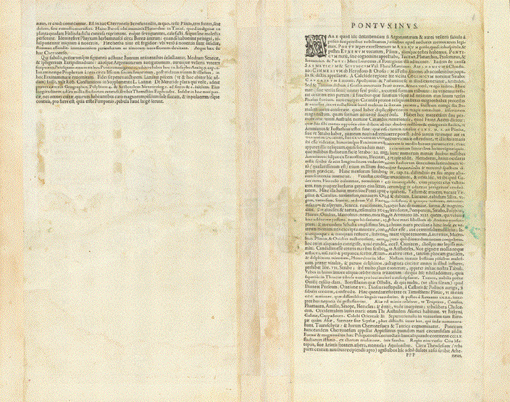 ãPontus Euxinus Aequor Iasonio pulsatum remige primum" The Black Sea Hand-colored copper etching. Published in ãParergon, sive veteris geographiae aliquot tabulae" - the historic part of ãTheatrum Orbis Terrarum" by Abraham Ortelius. Antwerp, 1590. Verso: Text in Latin about the Black Sea area. The attractive historic maps in the Ortelius atlas bear the old classical place- and land names. This map comprises all abutters of the Black Sea and rivers that run into the Black Sea. Starting from Turkey which owns a tiny corner of Europe and the entire Black Sea Coast in Asia we continue clockwise: Bulgaria, Romania, Ukraine, Russia, Georgia. A decorative title cartouche embellishes this very attractive map. There are some signs of age and